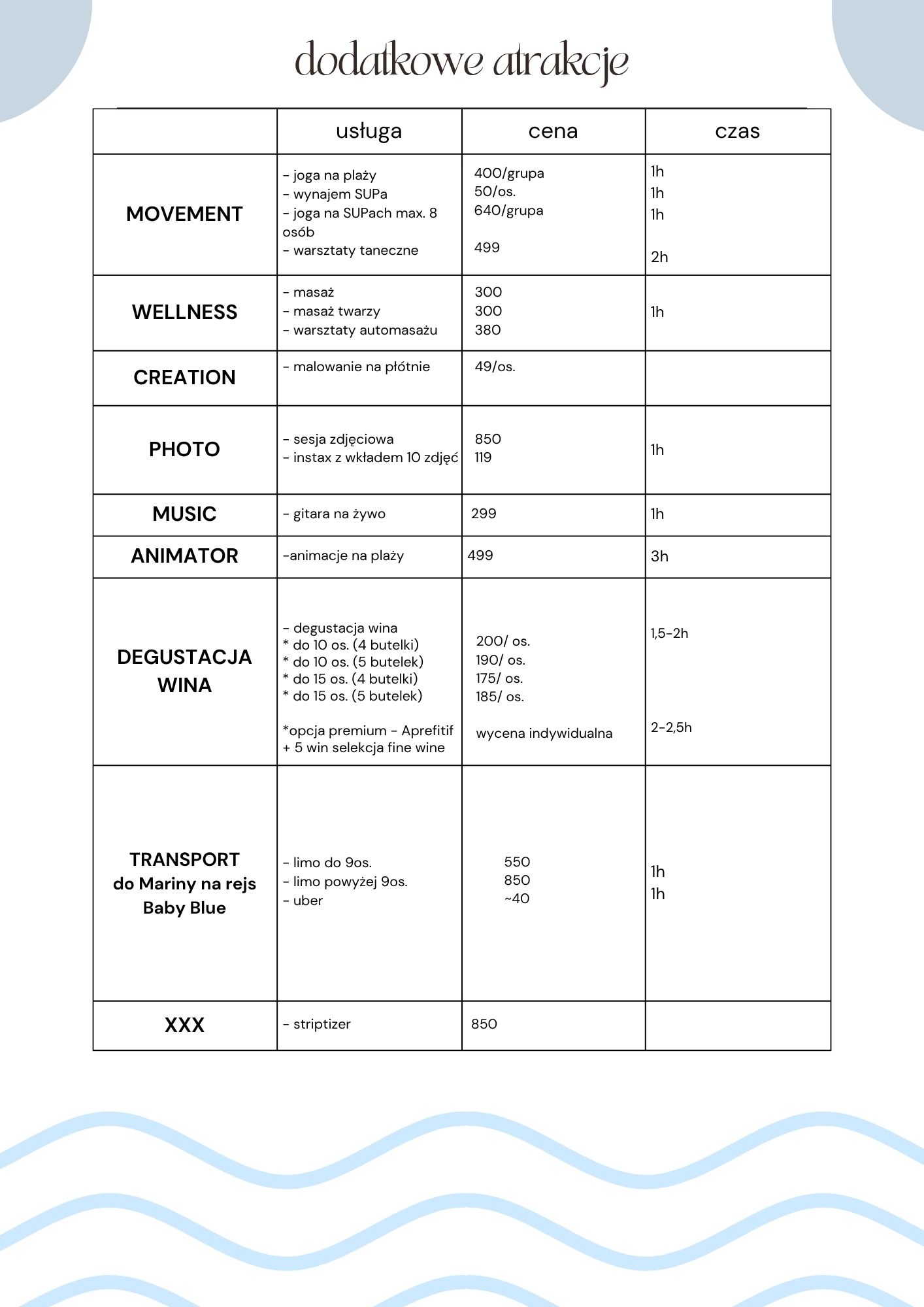 W ofercie dodatkowej znajdziecie skrzyneczko-stoliki, dodatkowe naczynia, dekoracje z żywych kwiatów, głośnik bluetooth, instaxa mini czy zestawy badmintona lub planszówki. Przygotowaliśmy dla Was też mnóstwo atrakcji, które mogą wzbogacić Wasz Wieczór Panieński. Zajęcia jogi/ jogi na SUPach, warsztaty, sesja zdjęciowa, malowanie przy winie, muzyka na żywo, catering, degustacja wina, a na koniec wisienka na torcie – REJS KATAMARANEM BABY BLUE – najpiękniejszym obiektem pływającym w Gdańsku. Pełną listę znajdziecie poniżej.
