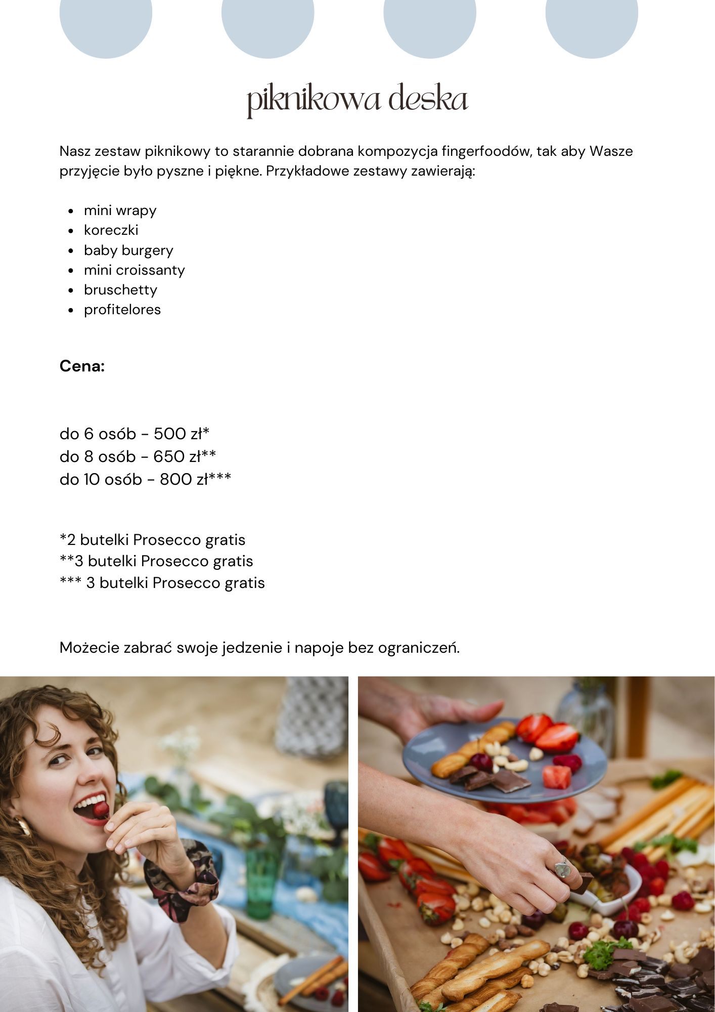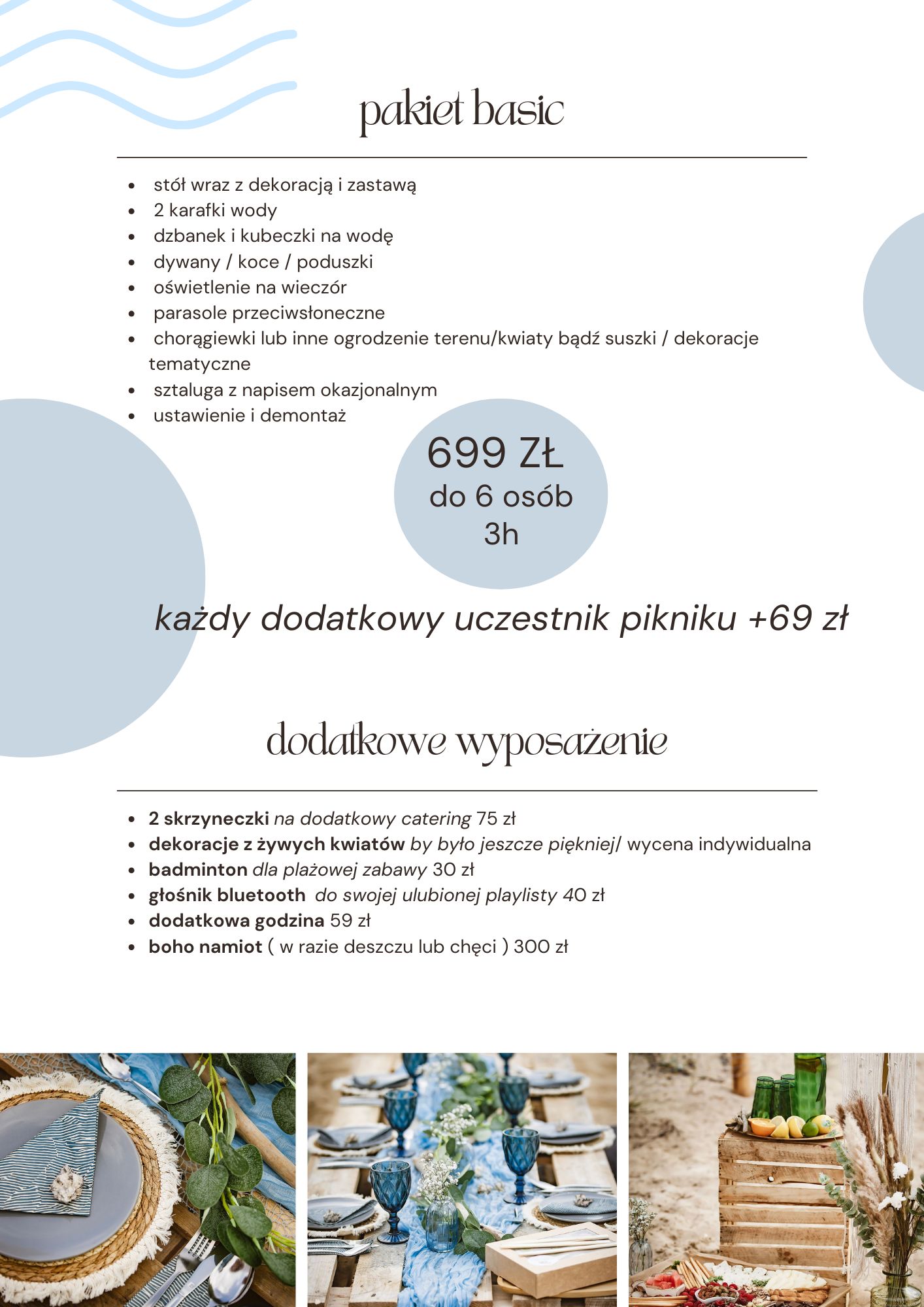 W pakiecie podstawowym otrzymacie w pełni udekorowane stoły wraz z zastawą, mięciutkie poduchy, stylowe dywany, kocyki dla zmarźlaków, klimatyczne oświetlenie, dekoracje, ręcznie malowany napis, odgrodzenie miejsca pikniku oraz parasole lub namiot w razie deszczu. Wszystko gotowe do świętowania, po Waszej stronie czysta przyjemność wspólnego czasu z Przyjaciółkami 🙂